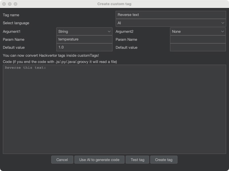 Gareth has enhanced Hackvertor with powerful new AI features that let you create custom tags for performing advanced transformations on a given input, all without writing a single line of code: