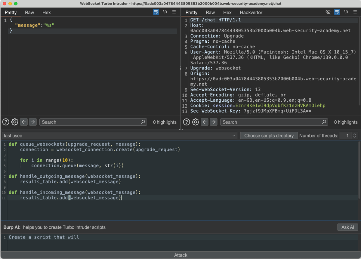 A quick word of caution - WebSocket Turbo Intruder is powerful. It can send thousands of messages per second and open many connections in parallel. If you’re not careful, you might overload the server or trigger denial-of-service conditions. Always use it on targets where automated scanning is allowed, and try not to take down the internet while you’re at it.