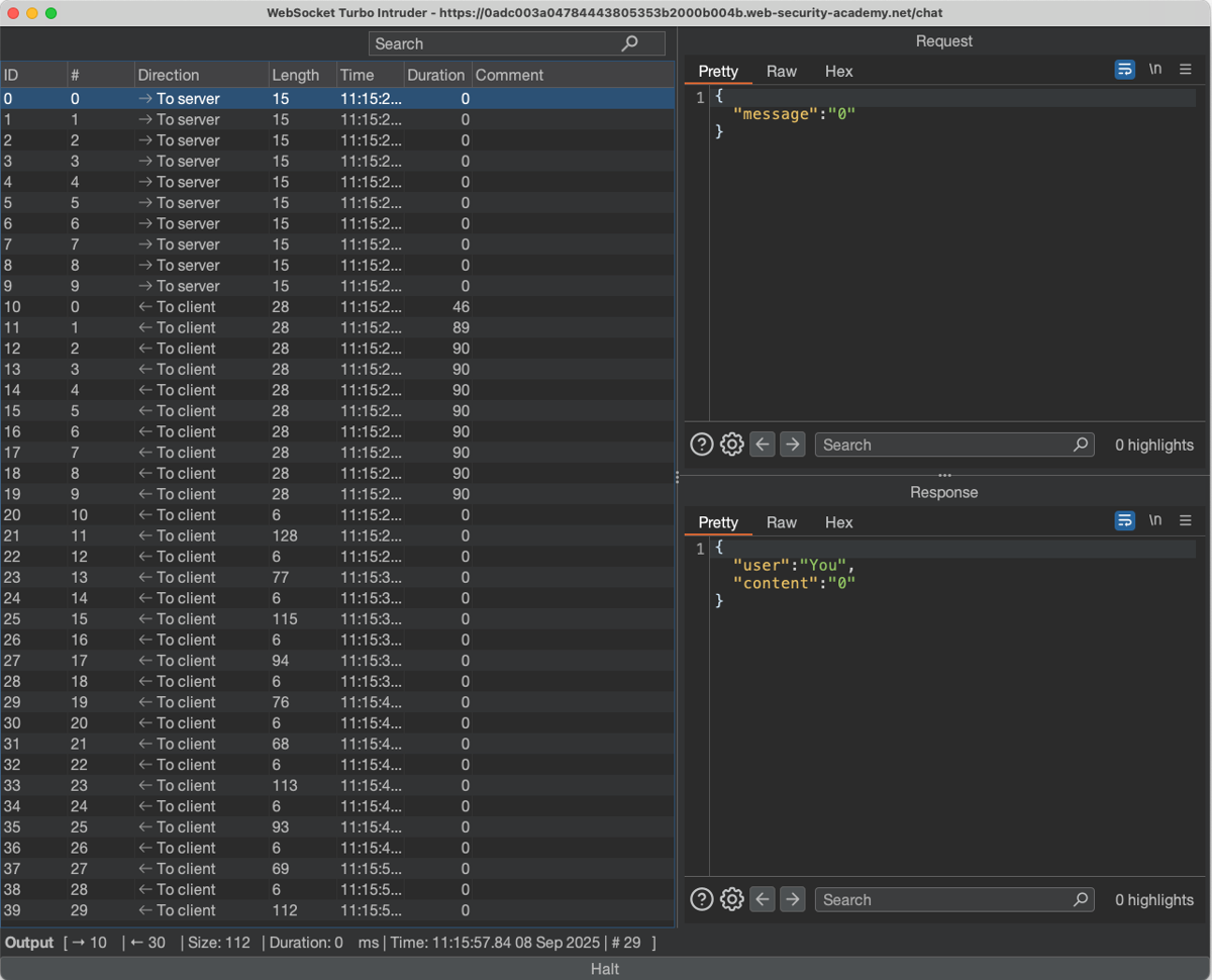 With the logger enabled on WebSocket Turbo Intruder → Logger On, you can track both message contents and their internal IDs. These IDs are used to pair requests and responses - so if something breaks or a message gets mismatched, you can inspect the logs to figure out what went wrong.