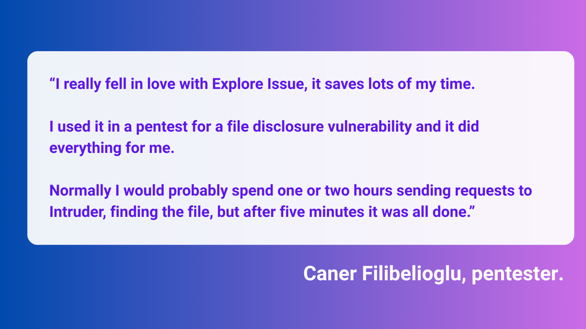 Explore Issue picks up where the scanner leaves off, automatically following up on findings to validate issues, demonstrate impact, and uncover hidden attack vectors. It’s like having an extra set of eyes on every alert – working tirelessly in the background.